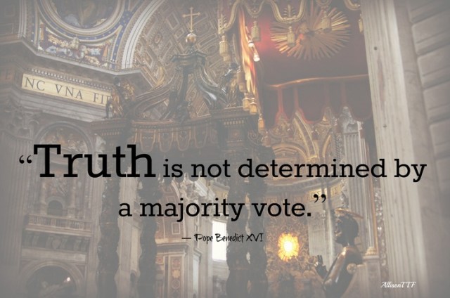 I can’t believe you just said that.  You might as well say that the color red no longer exists.  It’s impossible.  Those “norms” are the truth.  The truth does not change just because five old Supreme Court Justices said that it did.  Truth is always the same, no matter what crazy things society gets itself into.  Sin is still sin, no matter how many people say it’s not.  Truth, Goodness, and Beauty are always Truth, Goodness, and Beauty.  Those “norms” you’re so quick to dismiss may be under attack, but they still exist, and they always will.